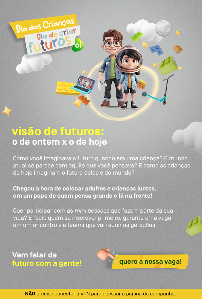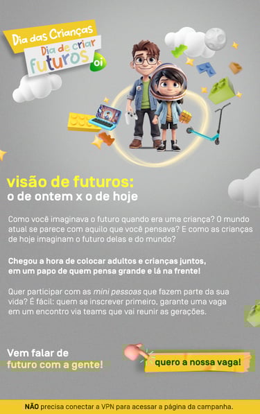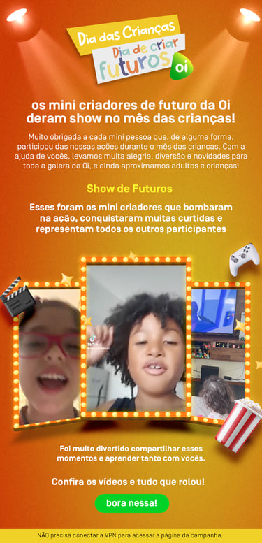 A campanha também incluiu o concurso “Mini Criadores de Futuro”, uma dinâmica especial que convidou os filhos dos colaboradores a enviarem vídeos demonstrando seus talentos — cantar, dançar, desenhar, construir, inventar ou qualquer habilidade que representasse seu potencial criativo. Esse componente reforçou o propósito da Oi de valorizar a expressão individual, incentivar novas gerações e aproximar ainda mais a comunidade interna.