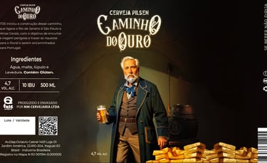 Já Caminho do Ouro resgata a importância histórica das rotas que passavam por Itaguaí e que foram fundamentais para o transporte de ouro entre o interior e o litoral. O rótulo explora texturas, símbolos e cores que evocam a estética colonial, reforçando a narrativa de riqueza histórica e de legado.