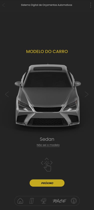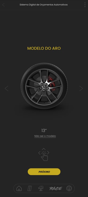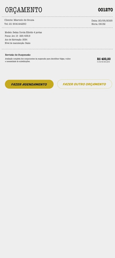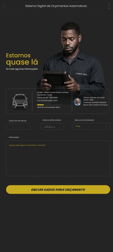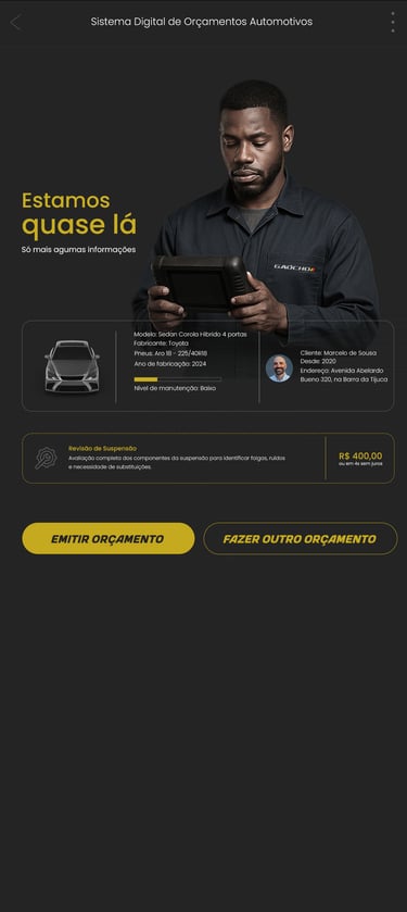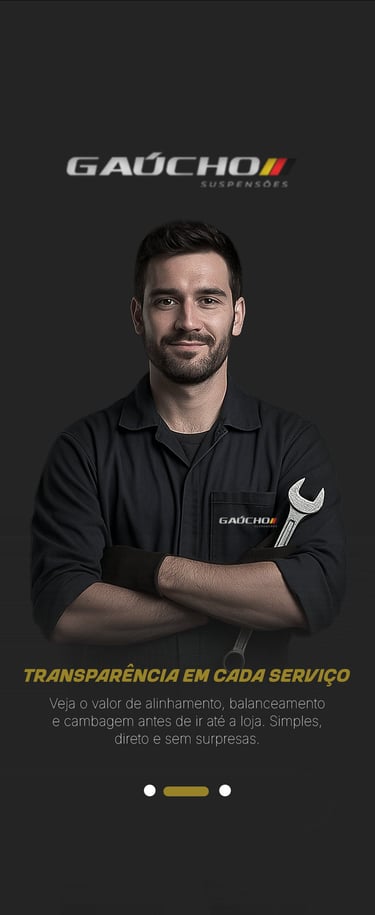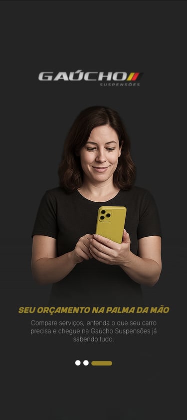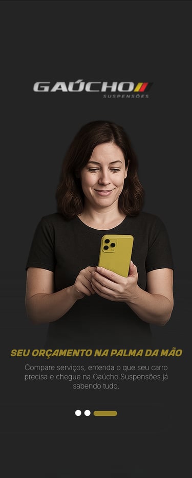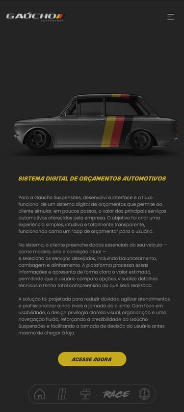 Para a Gaúcho Suspensões, desenvolvi a interface e o fluxo funcional de um sistema digital de orçamentos que permite ao cliente simular, em poucos passos, o valor dos principais serviços automotivos oferecidos pela empresa. O objetivo foi criar uma experiência simples, intuitiva e totalmente transparente, funcionando como um “app de orçamento” para o usuário.