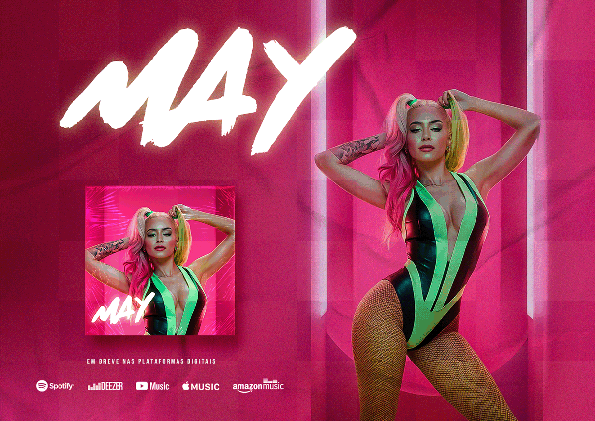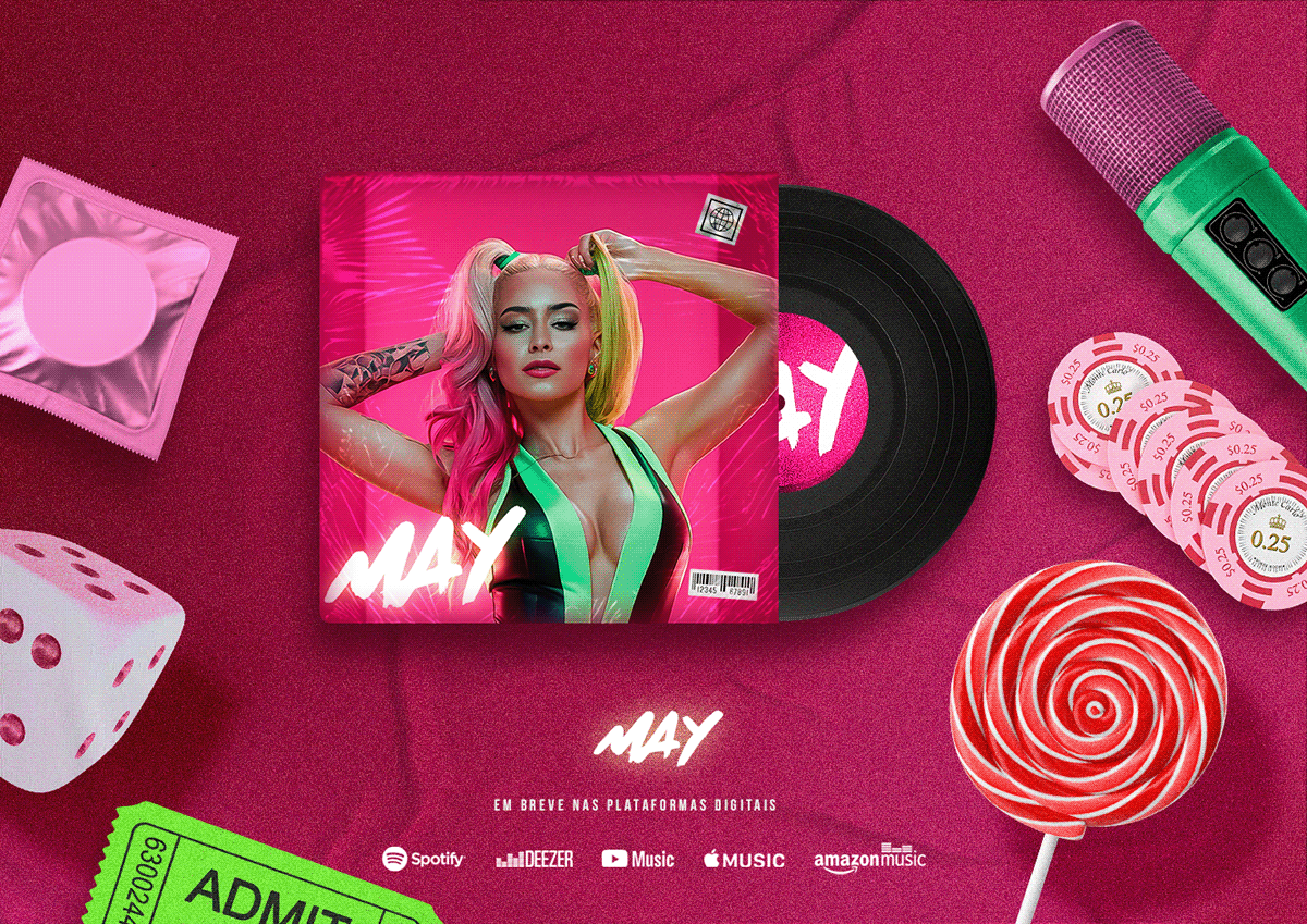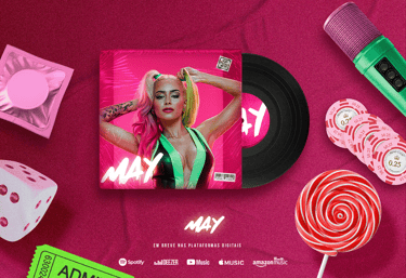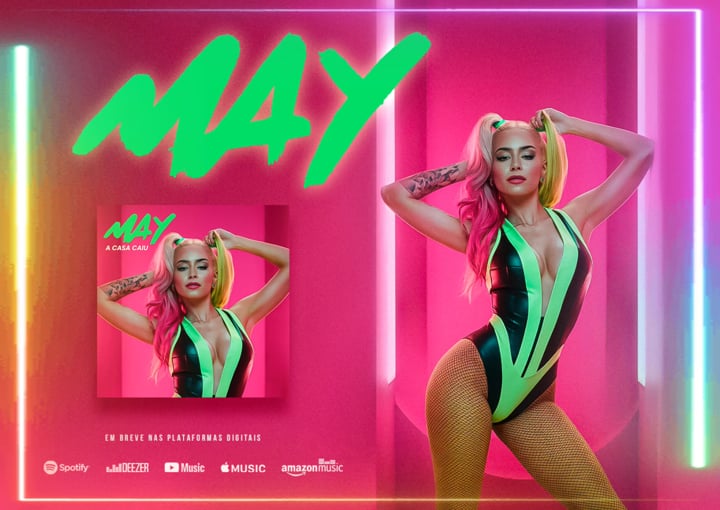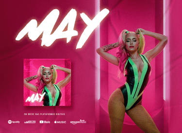 A partir desse conceito, desenvolvi materiais que apresentavam May ao público, incluindo identidade visual, peças promocionais e diretrizes estéticas que orientam sua comunicação. O foco foi equilibrar futurismo, humanidade e originalidade, criando uma cantora que, apesar de ser movida por IA, transmite emoções e propósito.